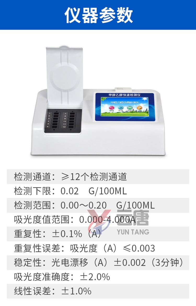 可快速定量檢測(cè)各類(lèi)酒中的甲醇的含量,儀器預(yù)留其他項(xiàng)目檢測(cè)程序和端口,根據(jù)日后需求可方便的自主增加檢測(cè)項(xiàng)目。日后可升級(jí)為檢測(cè),水產(chǎn)品,肉制品,面制品的綜合類(lèi)型儀器。