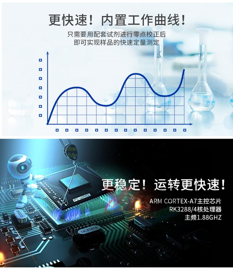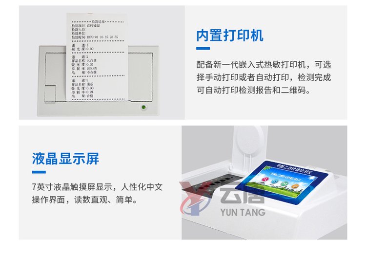 | 儀器采用臺(tái)式一體化系統(tǒng)檢測(cè)技術(shù),將分光光度模塊、新型農(nóng)殘檢測(cè)模塊、數(shù)字化管理模塊、無(wú)線通訊模塊高度集成于一體,支持檢測(cè)200種食品安全檢測(cè)項(xiàng)目,同時(shí)預(yù)留升級(jí)檢測(cè)方法。 | 儀器檢測(cè)模塊標(biāo)準(zhǔn)化、智能化,可隨意自由組合。檢測(cè)箱體內(nèi)置多個(gè)標(biāo)準(zhǔn)檢測(cè)單元,檢測(cè)模塊可以調(diào)整配置。 | 儀器采用全新安卓智能系統(tǒng),主控芯片采用 ARM Cortex-A7,RK3288/4核處理器,10.1寸高清液晶觸摸豎屏,更加**的UI交互界面,運(yùn)轉(zhuǎn)快捷;儀器配備無(wú)線通信模塊: 4G(APN)通訊模塊、Wifi模塊,藍(lán)牙傳輸,同時(shí)具有雙USB接口以及RJ45接口能以多種方式實(shí)現(xiàn)數(shù)據(jù)保存和數(shù)據(jù)傳輸功能。 | 創(chuàng)新檢測(cè)模式: | ★檢測(cè)通道:≥12通道;采用精密旋轉(zhuǎn)比色池設(shè)計(jì),使用同芯片同光源校準(zhǔn)精度,解決不同光源之間的誤差值。1-12通道間誤差0.1%。(***:**202022821055.2) | ★儀器具有自動(dòng)識(shí)別比色皿檢測(cè)功能,即:將樣品比色皿放入儀器后,點(diǎn)擊樣品檢測(cè),儀器自動(dòng)識(shí)別比色皿進(jìn)行通道檢測(cè)。 | 進(jìn)口高精光源: | 高精度進(jìn)口四波長(zhǎng)冷光源,通道配置 410、520、590、630nm 波長(zhǎng)光源,一個(gè)光源芯片驅(qū)動(dòng)一個(gè)光源,誤差極小,每臺(tái)設(shè)備單獨(dú)**校準(zhǔn)光源,**比對(duì),同時(shí)參照四種不同波段光源全方位覆蓋市面上99%的農(nóng)殘食品項(xiàng)目檢測(cè)。 | 智能化操作系統(tǒng): | 便捷操作系統(tǒng):設(shè)備檢測(cè)時(shí)可在同一檢測(cè)界面自動(dòng)對(duì)應(yīng)相關(guān)檢測(cè)通道一次性選擇1-12個(gè)樣品名稱(chēng),無(wú)須退出界面,節(jié)省操作時(shí)間。 | 數(shù)據(jù)集成系統(tǒng):設(shè)備首頁(yè)自動(dòng)統(tǒng)計(jì)檢測(cè)數(shù)據(jù)包含:周檢測(cè)數(shù)據(jù)、月檢測(cè)數(shù)據(jù),全部檢測(cè)總數(shù)量,均包含檢測(cè)總數(shù),合格數(shù),不合格數(shù),以及相關(guān)柱形分析圖,對(duì)各項(xiàng)檢測(cè)數(shù)據(jù)清晰掌握,無(wú)需電腦查詢(xún),更加快捷直觀。 | 項(xiàng)目預(yù)設(shè)系統(tǒng):支持添加單個(gè)及多個(gè)相同或不相同的任務(wù)預(yù)設(shè),一鍵快速調(diào)取,每一個(gè)任務(wù)分別可以設(shè)置不同的樣品、批次、編號(hào)、來(lái)源、備注、抽樣信息、檢測(cè)信息、受檢信息、復(fù)核信息等更多信息。無(wú)縫鏈接平臺(tái)和APP實(shí)時(shí)查看下發(fā)任務(wù)。 | 數(shù)據(jù)監(jiān)管系統(tǒng):同步對(duì)接監(jiān)管平臺(tái),數(shù)據(jù)可局域網(wǎng)和互聯(lián)網(wǎng)數(shù)據(jù)上傳,檢測(cè)結(jié)果可選擇直接傳至食品安全監(jiān)管平臺(tái)。集成OSS輸出存儲(chǔ)服務(wù)、區(qū)分設(shè)備定向管理應(yīng)用,進(jìn)行區(qū)域食品安全監(jiān)管及大數(shù)據(jù)分析處理與數(shù)據(jù)統(tǒng)計(jì),檢測(cè)區(qū)域食品安全長(zhǎng)短期動(dòng)態(tài),達(dá)到食品安全問(wèn)題預(yù)估、預(yù)警。 | 自定義打印系統(tǒng):內(nèi)置全新打印系統(tǒng),新創(chuàng)自定義打印方式,可按需靈活設(shè)置開(kāi)啟或關(guān)閉:產(chǎn)品合格證(國(guó)家農(nóng)業(yè)部標(biāo)準(zhǔn)要求),二維碼,抽樣信息、檢測(cè)信息,受檢信息、復(fù)核信息、抽樣日期、檢測(cè)日期等信息的打印。 | 系統(tǒng)遠(yuǎn)程更新功能:可定向分客戶(hù)分儀器更新系統(tǒng),按照不同客戶(hù)后期實(shí)際需求添加項(xiàng)目,無(wú)需機(jī)器返廠,即可遠(yuǎn)程實(shí)時(shí)升級(jí)全新系統(tǒng),節(jié)省時(shí)間成本及避免運(yùn)輸造成設(shè)備損壞。 | 儀器主機(jī)采用一體化防水、抗壓、防撞擊、防腐蝕箱體設(shè)計(jì),同時(shí)配備交直流供電,可連接車(chē)載電源,可選配大容量充電鋰電池,滿(mǎn)足現(xiàn)場(chǎng)野外檢測(cè)需求。 | 安全證書(shū),放心保障:儀器具有中國(guó)計(jì)量科學(xué)研究院校準(zhǔn)證書(shū),權(quán)威認(rèn)證。 |