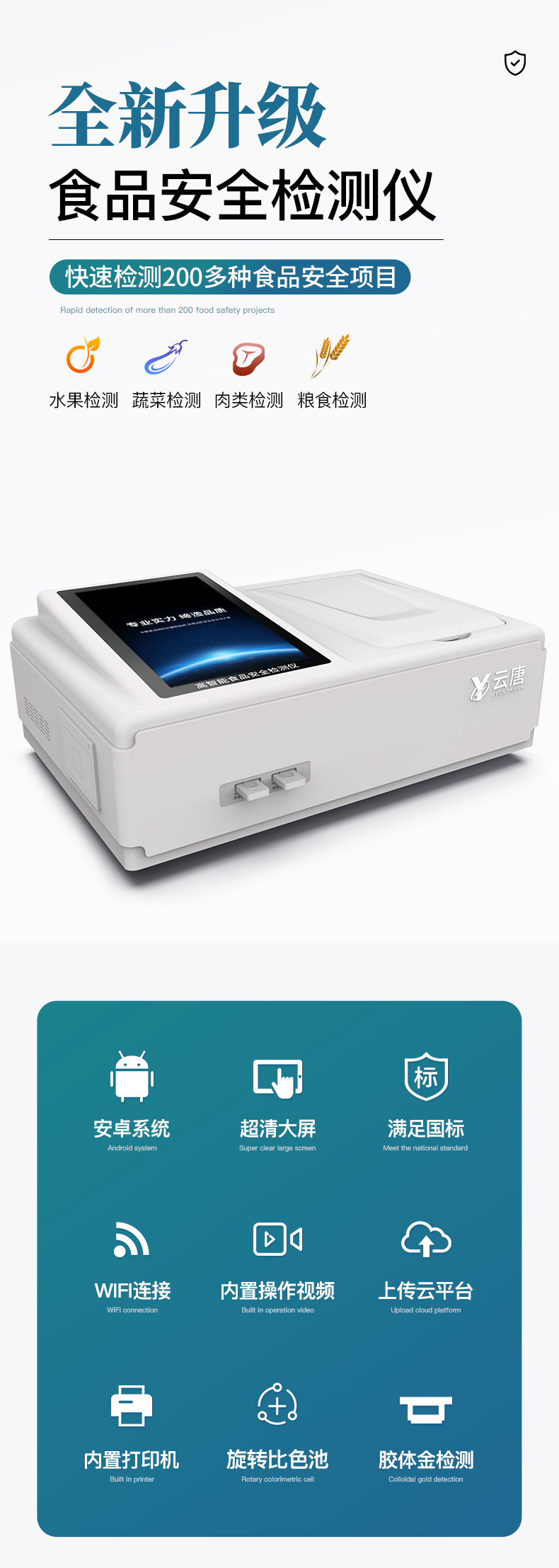 | 儀器采用臺(tái)式一體化系統(tǒng)檢測(cè)技術(shù),將分光光度模塊、新型農(nóng)殘檢測(cè)模塊、數(shù)字化管理模塊、無(wú)線通訊模塊高度集成于一體,支持檢測(cè)200種食品安全檢測(cè)項(xiàng)目,同時(shí)預(yù)留升級(jí)檢測(cè)方法。 | 儀器檢測(cè)模塊標(biāo)準(zhǔn)化、智能化,可隨意自由組合。檢測(cè)箱體內(nèi)置多個(gè)標(biāo)準(zhǔn)檢測(cè)單元,檢測(cè)模塊可以調(diào)整配置。 | 儀器采用全新安卓智能系統(tǒng),主控芯片采用 ARM Cortex-A7,RK3288/4核處理器,10.1寸高清液晶觸摸豎屏,更加**的UI交互界面,運(yùn)轉(zhuǎn)快捷;儀器配備無(wú)線通信模塊: 4G(APN)通訊模塊、Wifi模塊,藍(lán)牙傳輸,同時(shí)具有雙USB接口以及RJ45接口能以多種方式實(shí)現(xiàn)數(shù)據(jù)保存和數(shù)據(jù)傳輸功能。 | 創(chuàng)新檢測(cè)模式: | ★檢測(cè)通道:≥12通道;采用精密旋轉(zhuǎn)比色池設(shè)計(jì),使用同芯片同光源校準(zhǔn)精度,解決不同光源之間的誤差值。1-12通道間誤差0.1%。(***:**202022821055.2) | ★儀器具有自動(dòng)識(shí)別比色皿檢測(cè)功能,即:將樣品比色皿放入儀器后,點(diǎn)擊樣品檢測(cè),儀器自動(dòng)識(shí)別比色皿進(jìn)行通道檢測(cè)。 | 進(jìn)口高精光源: | 高精度進(jìn)口四波長(zhǎng)冷光源,通道配置 410、520、590、630nm 波長(zhǎng)光源,一個(gè)光源芯片驅(qū)動(dòng)一個(gè)光源,誤差極小,每臺(tái)設(shè)備單獨(dú)**校準(zhǔn)光源,**比對(duì),同時(shí)參照四種不同波段光源全方位覆蓋市面上99%的農(nóng)殘食品項(xiàng)目檢測(cè)。 | 智能化操作系統(tǒng): | 便捷操作系統(tǒng):設(shè)備檢測(cè)時(shí)可在同一檢測(cè)界面自動(dòng)對(duì)應(yīng)相關(guān)檢測(cè)通道一次性選擇1-12個(gè)樣品名稱,無(wú)須退出界面,節(jié)省操作時(shí)間。 | 數(shù)據(jù)集成系統(tǒng):設(shè)備首頁(yè)自動(dòng)統(tǒng)計(jì)檢測(cè)數(shù)據(jù)包含:周檢測(cè)數(shù)據(jù)、月檢測(cè)數(shù)據(jù),全部檢測(cè)總數(shù)量,均包含檢測(cè)總數(shù),合格數(shù),不合格數(shù),以及相關(guān)柱形分析圖,對(duì)各項(xiàng)檢測(cè)數(shù)據(jù)清晰掌握,無(wú)需電腦查詢,更加快捷直觀。 | 項(xiàng)目預(yù)設(shè)系統(tǒng):支持添加單個(gè)及多個(gè)相同或不相同的任務(wù)預(yù)設(shè),一鍵快速調(diào)取,每一個(gè)任務(wù)分別可以設(shè)置不同的樣品、批次、編號(hào)、來(lái)源、備注、抽樣信息、檢測(cè)信息、受檢信息、復(fù)核信息等更多信息。無(wú)縫鏈接平臺(tái)和APP實(shí)時(shí)查看下發(fā)任務(wù)。 | 數(shù)據(jù)監(jiān)管系統(tǒng):同步對(duì)接監(jiān)管平臺(tái),數(shù)據(jù)可局域網(wǎng)和互聯(lián)網(wǎng)數(shù)據(jù)上傳,檢測(cè)結(jié)果可選擇直接傳至食品安全監(jiān)管平臺(tái)。集成OSS輸出存儲(chǔ)服務(wù)、區(qū)分設(shè)備定向管理應(yīng)用,進(jìn)行區(qū)域食品安全監(jiān)管及大數(shù)據(jù)分析處理與數(shù)據(jù)統(tǒng)計(jì),檢測(cè)區(qū)域食品安全長(zhǎng)短期動(dòng)態(tài),達(dá)到食品安全問(wèn)題預(yù)估、預(yù)警。 | 自定義打印系統(tǒng):內(nèi)置全新打印系統(tǒng),新創(chuàng)自定義打印方式,可按需靈活設(shè)置開(kāi)啟或關(guān)閉:產(chǎn)品合格證(國(guó)家農(nóng)業(yè)部標(biāo)準(zhǔn)要求),二維碼,抽樣信息、檢測(cè)信息,受檢信息、復(fù)核信息、抽樣日期、檢測(cè)日期等信息的打印。 | 系統(tǒng)遠(yuǎn)程更新功能:可定向分客戶分儀器更新系統(tǒng),按照不同客戶后期實(shí)際需求添加項(xiàng)目,無(wú)需機(jī)器返廠,即可遠(yuǎn)程實(shí)時(shí)升級(jí)全新系統(tǒng),節(jié)省時(shí)間成本及避免運(yùn)輸造成設(shè)備損壞。 | 儀器主機(jī)采用一體化防水、抗壓、防撞擊、防腐蝕箱體設(shè)計(jì),同時(shí)配備交直流供電,可連接車(chē)載電源,可選配大容量充電鋰電池,滿足現(xiàn)場(chǎng)野外檢測(cè)需求。 | 安全證書(shū),放心保障:儀器具有中國(guó)計(jì)量科學(xué)研究院校準(zhǔn)證書(shū),權(quán)威認(rèn)證。 |
