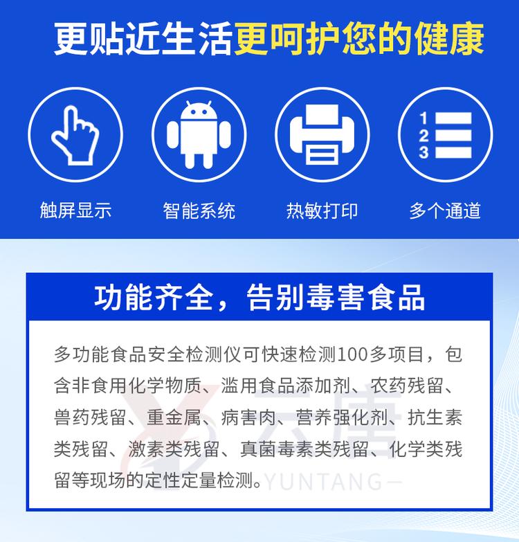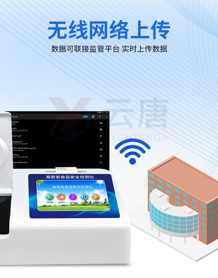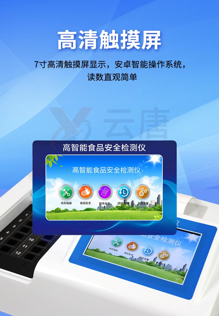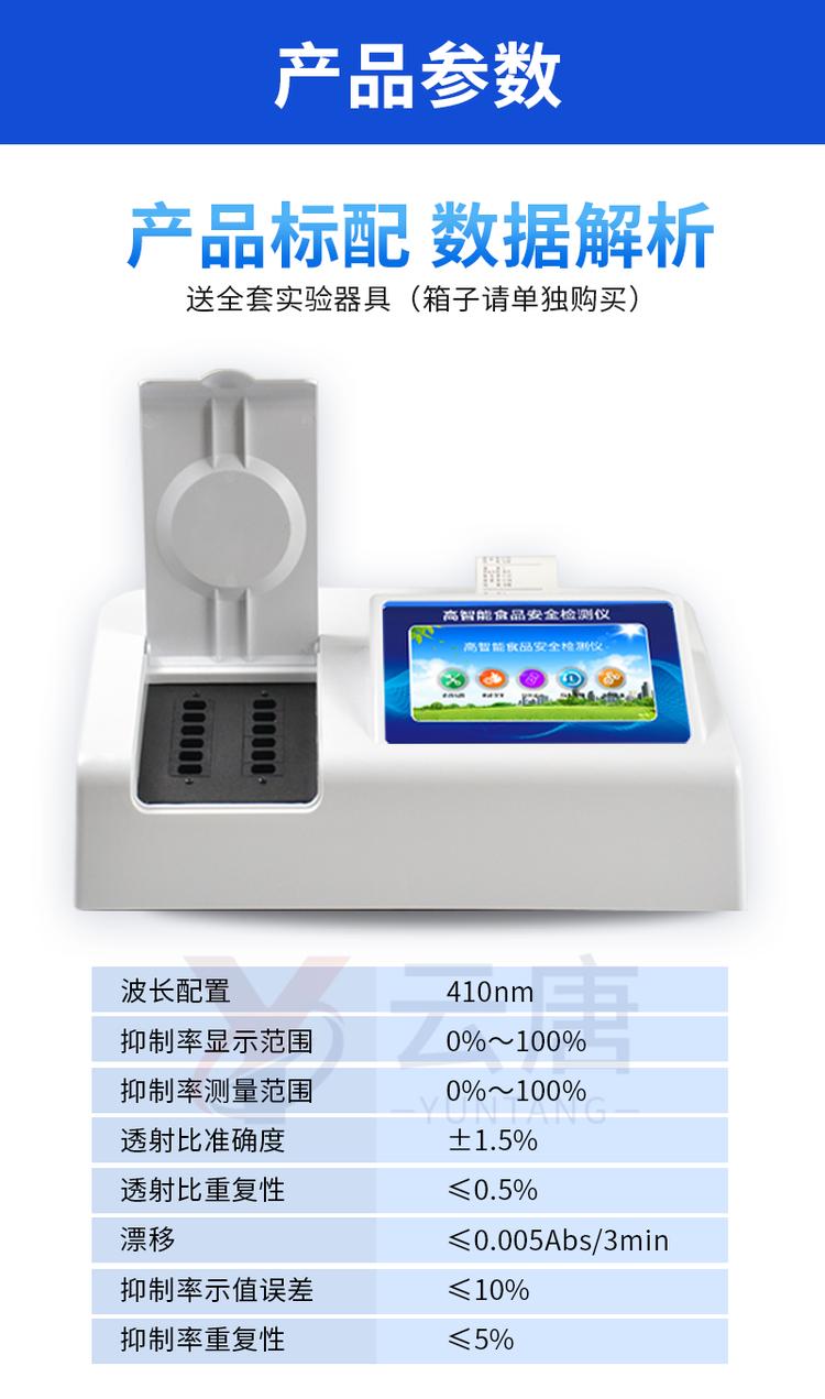 | 儀器采用臺式一體化系統(tǒng)檢測技術,將分光光度模塊、新型農(nóng)殘檢測模塊、數(shù)字化管理模塊、無線通訊模塊高度集成于一體,支持檢測200種食品安全檢測項目,同時預留升級檢測方法。 | 儀器檢測模塊標準化、智能化,可隨意自由組合。檢測箱體內(nèi)置多個標準檢測單元,檢測模塊可以調(diào)整配置。 | 儀器采用全新安卓智能系統(tǒng),主控芯片采用 ARM Cortex-A7,RK3288/4核處理器,10.1寸高清液晶觸摸豎屏,更加**的UI交互界面,運轉(zhuǎn)快捷;儀器配備無線通信模塊: 4G(APN)通訊模塊、Wifi模塊,藍牙傳輸,同時具有雙USB接口以及RJ45接口能以多種方式實現(xiàn)數(shù)據(jù)保存和數(shù)據(jù)傳輸功能。 | 創(chuàng)新檢測模式: | ★檢測通道:≥12通道;采用精密旋轉(zhuǎn)比色池設計,使用同芯片同光源校準精度,解決不同光源之間的誤差值。1-12通道間誤差0.1%。(***:**202022821055.2) | ★儀器具有自動識別比色皿檢測功能,即:將樣品比色皿放入儀器后,點擊樣品檢測,儀器自動識別比色皿進行通道檢測。 | 進口高精光源: | 高精度進口四波長冷光源,通道配置 410、520、590、630nm 波長光源,一個光源芯片驅(qū)動一個光源,誤差極小,每臺設備單獨**校準光源,**比對,同時參照四種不同波段光源全方位覆蓋市面上99%的農(nóng)殘食品項目檢測。 | 智能化操作系統(tǒng): | 便捷操作系統(tǒng):設備檢測時可在同一檢測界面自動對應相關檢測通道一次性選擇1-12個樣品名稱,無須退出界面,節(jié)省操作時間。 | 數(shù)據(jù)集成系統(tǒng):設備首頁自動統(tǒng)計檢測數(shù)據(jù)包含:周檢測數(shù)據(jù)、月檢測數(shù)據(jù),全部檢測總數(shù)量,均包含檢測總數(shù),合格數(shù),不合格數(shù),以及相關柱形分析圖,對各項檢測數(shù)據(jù)清晰掌握,無需電腦查詢,更加快捷直觀。 | 項目預設系統(tǒng):支持添加單個及多個相同或不相同的任務預設,一鍵快速調(diào)取,每一個任務分別可以設置不同的樣品、批次、編號、來源、備注、抽樣信息、檢測信息、受檢信息、復核信息等更多信息。無縫鏈接平臺和APP實時查看下發(fā)任務。 | 數(shù)據(jù)監(jiān)管系統(tǒng):同步對接監(jiān)管平臺,數(shù)據(jù)可局域網(wǎng)和互聯(lián)網(wǎng)數(shù)據(jù)上傳,檢測結(jié)果可選擇直接傳至食品安全監(jiān)管平臺。集成OSS輸出存儲服務、區(qū)分設備定向管理應用,進行區(qū)域食品安全監(jiān)管及大數(shù)據(jù)分析處理與數(shù)據(jù)統(tǒng)計,檢測區(qū)域食品安全長短期動態(tài),達到食品安全問題預估、預警。 | 自定義打印系統(tǒng):內(nèi)置全新打印系統(tǒng),新創(chuàng)自定義打印方式,可按需靈活設置開啟或關閉:產(chǎn)品合格證(國家農(nóng)業(yè)部標準要求),二維碼,抽樣信息、檢測信息,受檢信息、復核信息、抽樣日期、檢測日期等信息的打印。 | 系統(tǒng)遠程更新功能:可定向分客戶分儀器更新系統(tǒng),按照不同客戶后期實際需求添加項目,無需機器返廠,即可遠程實時升級全新系統(tǒng),節(jié)省時間成本及避免運輸造成設備損壞。 | 儀器主機采用一體化防水、抗壓、防撞擊、防腐蝕箱體設計,同時配備交直流供電,可連接車載電源,可選配大容量充電鋰電池,滿足現(xiàn)場野外檢測需求。 | 安全證書,放心保障:儀器具有中國計量科學研究院校準證書,權威認證。 |