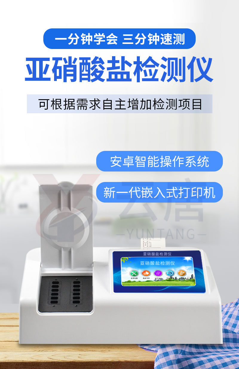 YT-Y12食品中亞硝酸鹽快速檢測(cè)儀為集成化食品安全檢測(cè)分析設(shè)備,能夠快速檢測(cè)肉類、肉類罐頭、熏肉、香腸、奶制品、泡菜、腌制蔬菜等中的亞硝酸鹽含量;該儀器是根據(jù)GB5009.33-2010《食品中亞硝酸鹽與硝酸鹽的測(cè)定》,食品中的亞硝酸鹽經(jīng)過提取,與檢測(cè)試劑反應(yīng)生成有色化合物,再利用亞硝酸鹽檢測(cè)儀測(cè)定其吸光度,在一定范圍內(nèi)吸光度與含量成正比。通過檢測(cè)可確定食品是否符合國(guó)家標(biāo)準(zhǔn)或是否為超標(biāo)毒害食品等。儀器預(yù)留其他項(xiàng)目檢測(cè)程序和端口,根據(jù)日后需求可方便的自主增加檢測(cè)項(xiàng)目。日后可升級(jí)為檢測(cè)水產(chǎn)品、面制品的綜合類型儀器。