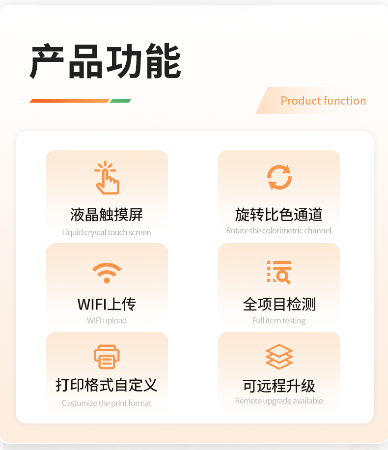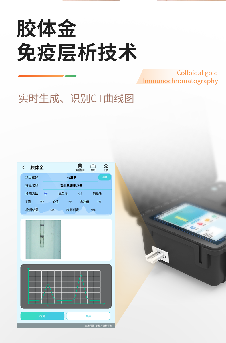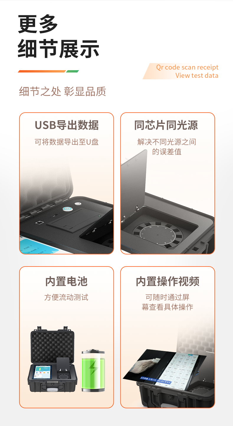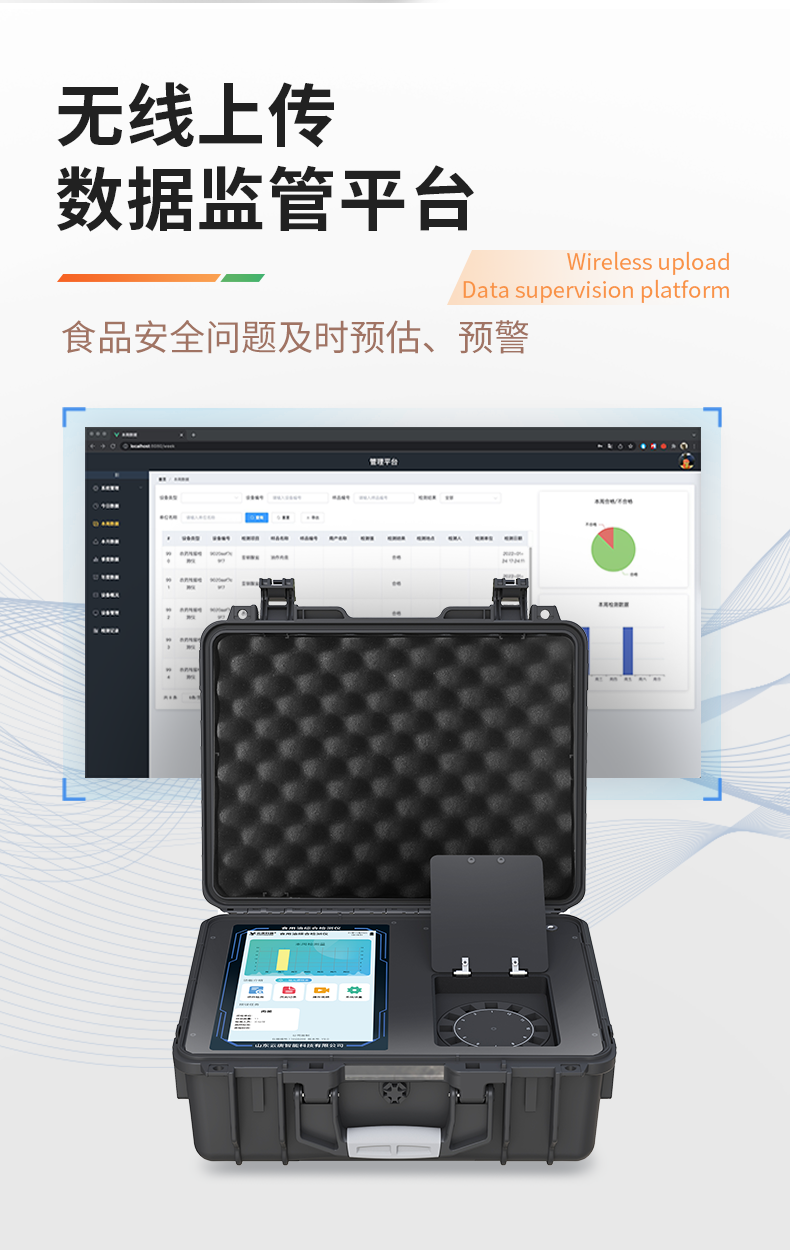 | 1、儀器采用手提一體化系統(tǒng)檢測技術(shù),將分光光度模塊、膠體金檢測模塊、新型農(nóng)殘檢測模塊、數(shù)字化管理模塊、無線通訊模塊高度集成于一體,支持檢測200種食品安全檢測項目,同時預(yù)留升級檢測方法。 | 2、儀器檢測模塊標(biāo)準(zhǔn)化、智能化,檢測項目可隨意自由組合。檢測箱體內(nèi)置多個標(biāo)準(zhǔn)檢測單元,檢測模塊可以調(diào)整配置。 | 3、顯示屏幕:儀器采用10.1英寸豎向液晶觸摸屏顯,搭配運行安卓智能操作系統(tǒng),主控芯片采用ARM Cortex-A7,RK3288/4核處理器,主頻1.88Ghz,操作方便,性能更強。 | 4、檢測通道:≥12通道;采用精密旋轉(zhuǎn)比色池設(shè)計,使用同芯片同光源校準(zhǔn)精度,解決不同光源之間的誤差值,更加準(zhǔn)確**。(1-12通道間誤差0.1%,***:**202022821055.2) | 5、儀器光源:高精度進口四波長冷光源,每個通道均配置 410、520、590、630nm 波長光源,標(biāo)配**的光路切換裝置,專利光路切換功能可實現(xiàn)64波長,并且所有檢測項目可實現(xiàn)所有通道同時檢測。 | 6、設(shè)備可一鍵校準(zhǔn),自動保存校準(zhǔn)數(shù)據(jù),自動對比校驗,得到精準(zhǔn)光源,采用Android SP存儲數(shù)據(jù),光源數(shù)據(jù)永不丟失,方便每一次使用。 | 7、通訊接口:配備無線通信模塊、4G(APN)通訊模塊、藍牙傳輸,同時具有雙USB接口以及RJ45網(wǎng)線接口,可以多方式實現(xiàn)數(shù)據(jù)保存及數(shù)據(jù)傳輸。 | 8、存儲方式:支持U盤存儲,標(biāo)準(zhǔn)USB接口,免驅(qū)動安裝。檢測結(jié)果存儲容量20萬條以上,可生成Excel表格進行拷貝,并具有登錄保護功能。 | 9、智能化操作系統(tǒng): | 9.1、操作系統(tǒng):儀器可在同一檢測界面自動對應(yīng)相關(guān)檢測通道,一次性選擇1-12個樣品名稱,無需退出界面,節(jié)省操作時間。并可以對每個通道屬性和樣品信息單獨進行編輯,例如送檢單位、人員,檢測人員等,打印時勾選打印顯示。 | 9.2、數(shù)據(jù)集成系統(tǒng):設(shè)備首頁自動匯總分析檢測數(shù)據(jù),包含:周檢測數(shù)據(jù)、月檢測數(shù)據(jù),全部檢測總數(shù)量,包含檢測總數(shù),合格數(shù),不合格數(shù),以及相關(guān)柱形分析圖,各項檢測數(shù)據(jù)一目了然,無需電腦查詢,更加快捷直觀。 | 9.3、數(shù)據(jù)庫系統(tǒng):十幾項數(shù)據(jù)庫分類管理儀器:包含項目類型、項目數(shù)據(jù)、檢測數(shù)據(jù)、歷史記錄、國標(biāo)信息、曲線信息、采樣信息、檢測信息、受檢信息、復(fù)核信息、圖表信息、光源校準(zhǔn)信息、打印樣式信息、樣品庫信息等等,數(shù)據(jù)庫之間互相協(xié)調(diào)聯(lián)動保證數(shù)據(jù)的真實完整性。同時產(chǎn)品數(shù)據(jù)庫以及歷史檢測記錄支持一鍵檢索功能。 | 9.4、限量規(guī)判系統(tǒng):具有限量查詢、添加物質(zhì)合規(guī)判定系統(tǒng)。檢測出結(jié)果后,系統(tǒng)自動調(diào)用系統(tǒng)數(shù)據(jù)庫中相關(guān)國標(biāo)進行比對判定,客觀顯示判定結(jié)果是否合格。 | 9.5、項目預(yù)設(shè)系統(tǒng):儀器具有任務(wù)預(yù)設(shè)模塊,一鍵提前預(yù)設(shè),給出方便快捷的新檢測方案,每一個任務(wù)分別可以設(shè)置不同的樣品、批次、編號、來源、備注、抽樣信息、檢測信息、受檢信息、復(fù)核信息等更多信息。樣品送檢時一鍵調(diào)取保存信息,并可多次調(diào)取,大大提高檢測效率。 | 9.6、數(shù)據(jù)監(jiān)管系統(tǒng):同步對接監(jiān)管平臺,數(shù)據(jù)可局域網(wǎng)和互聯(lián)網(wǎng)數(shù)據(jù)上傳,檢測結(jié)果可直接傳至食品安全監(jiān)管平臺。進行區(qū)域食品安全監(jiān)管及大數(shù)據(jù)分析處理與數(shù)據(jù)統(tǒng)計,監(jiān)測區(qū)域食品安全長短期動態(tài)及問題預(yù)估、預(yù)警。 | 9.7.1、全新打印系統(tǒng):內(nèi)置全新打印機,新創(chuàng)自定義打印方式,可按需靈活勾選控制:產(chǎn)品合格證(國家農(nóng)業(yè)部標(biāo)準(zhǔn)要求),二維碼,抽樣信息、檢測信息,受檢信息、復(fù)核信息、抽樣日期、檢測日期等信息的打印。 | 9.7.2、A4紙版本報告打印功能(可選配):設(shè)備擁有兩種結(jié)果展示方式,可以自動生成A4打印模板和小票打印模板兩種樣式,可通過WiFi及網(wǎng)線等方式鏈接外置打印機可進行打印。 | 10、供電模式:儀器交直流兩用,直流12V供電,可連接車載電源,配6ah大容量充電鋰電池,電量可實時顯示,方便戶外流動測試。 | 11、膠體金檢測模塊:采用單通道CMOS成像處理技術(shù)及膠體金免疫層析技術(shù),可讀取膠體金卡數(shù)據(jù),自動采集、處理分析,將檢測結(jié)果顯示,并可根據(jù)參考限值自動判斷檢測結(jié)果,可檢測常見的獸藥殘留、生物毒素、抗生素、違禁添加物等。 | 11.1、探測技術(shù):CMOS成像探測; | 11.2、檢測通道:1個通道; | 11.3、檢測方式:消線法和比色法; | 11.4、顯示模式:陰性或陽性; | 11.5、曲線形式:軌道式掃描方式,顯示金標(biāo)卡圖像,實時生成、識別CT曲線圖,無需手動調(diào)整,完成檢測后自動退出檢測卡。兼容市場上其他金標(biāo)卡,使用耗材不受限制。 | 12、儀器具備遠(yuǎn)程升級功能,可定向分客戶分儀器更新,開機后自動更新,并可持續(xù)性免費更新系統(tǒng)版本,無需像傳統(tǒng)產(chǎn)品返廠更
