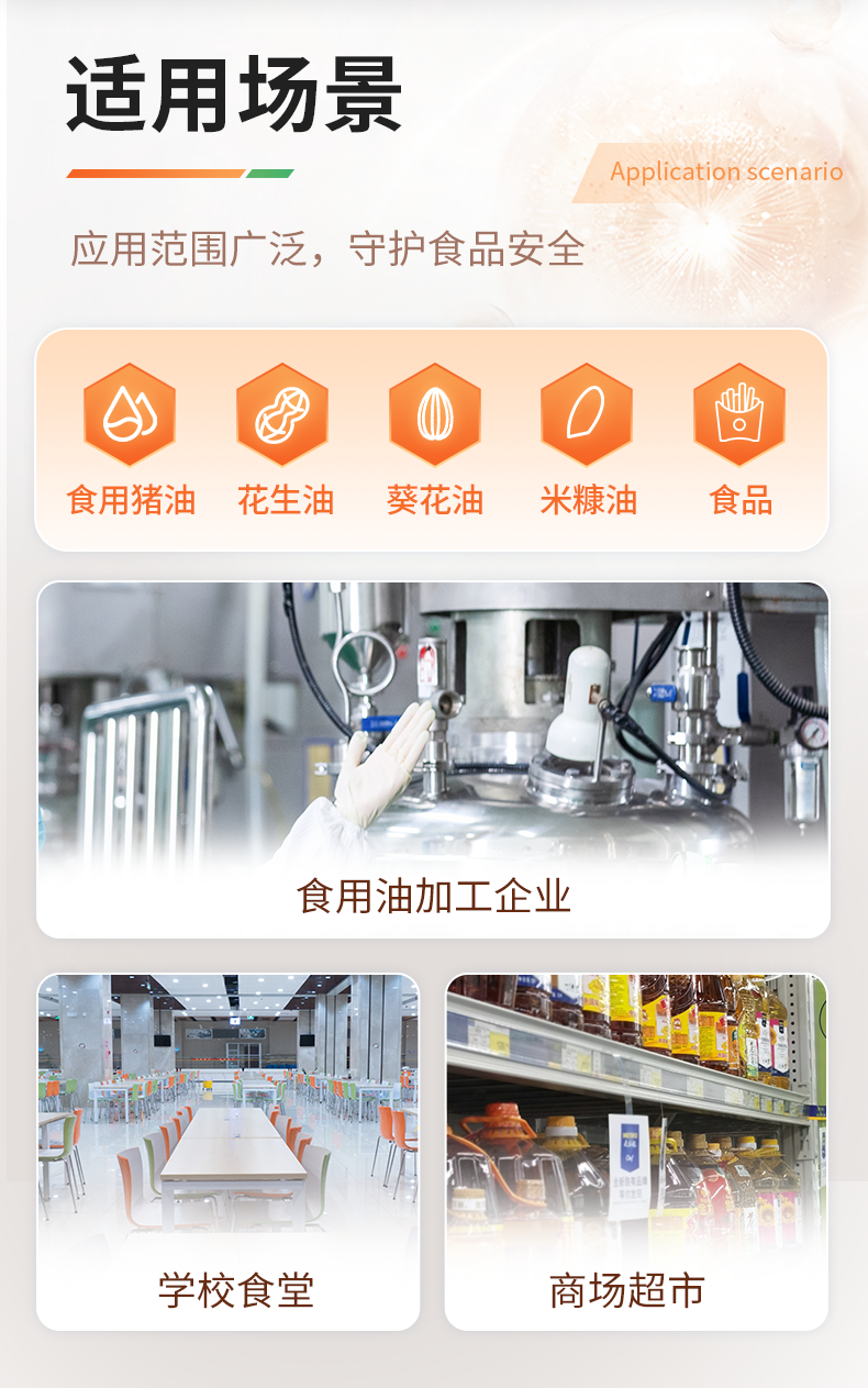 該食用油綜合檢測儀為集成化食品安全快速檢測分析設(shè)備,目前已于市場監(jiān)管局、食用油加工企業(yè)、學(xué)校食堂、衛(wèi)生部門、配送中心、商場超市等單位廣泛使用。。