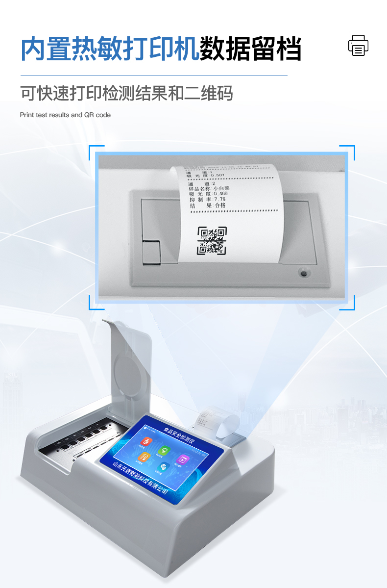 | 儀器采用臺式一體化系統(tǒng)檢測技術(shù),將分光光度模塊、新型農(nóng)殘檢測模塊、數(shù)字化管理模塊、無線通訊模塊高度集成于一體,支持檢測200種食品安全檢測項目,同時預留升級檢測方法。 | 儀器檢測模塊標準化、智能化,可隨意自由組合。檢測箱體內(nèi)置多個標準檢測單元,檢測模塊可以調(diào)整配置。 | 儀器采用全新安卓智能系統(tǒng),主控芯片采用 ARM Cortex-A7,RK3288/4核處理器,10.1寸高清液晶觸摸豎屏,更加**的UI交互界面,運轉(zhuǎn)快捷;儀器配備無線通信模塊: 4G(APN)通訊模塊、Wifi模塊,藍牙傳輸,同時具有雙USB接口以及RJ45接口能以多種方式實現(xiàn)數(shù)據(jù)保存和數(shù)據(jù)傳輸功能。 | 創(chuàng)新檢測模式: | ★檢測通道:≥12通道;采用精密旋轉(zhuǎn)比色池設(shè)計,使用同芯片同光源校準精度,解決不同光源之間的誤差值。1-12通道間誤差0.1%。(***:**202022821055.2) | ★儀器具有自動識別比色皿檢測功能,即:將樣品比色皿放入儀器后,點擊樣品檢測,儀器自動識別比色皿進行通道檢測。 | 進口高精光源: | 高精度進口四波長冷光源,通道配置 410、520、590、630nm 波長光源,一個光源芯片驅(qū)動一個光源,誤差極小,每臺設(shè)備單獨**校準光源,**比對,同時參照四種不同波段光源全方位覆蓋市面上99%的農(nóng)殘食品項目檢測。 | 智能化操作系統(tǒng): | 便捷操作系統(tǒng):設(shè)備檢測時可在同一檢測界面自動對應(yīng)相關(guān)檢測通道一次性選擇1-12個樣品名稱,無須退出界面,節(jié)省操作時間。 | 數(shù)據(jù)集成系統(tǒng):設(shè)備首頁自動統(tǒng)計檢測數(shù)據(jù)包含:周檢測數(shù)據(jù)、月檢測數(shù)據(jù),全部檢測總數(shù)量,均包含檢測總數(shù),合格數(shù),不合格數(shù),以及相關(guān)柱形分析圖,對各項檢測數(shù)據(jù)清晰掌握,無需電腦查詢,更加快捷直觀。 | 項目預設(shè)系統(tǒng):支持添加單個及多個相同或不相同的任務(wù)預設(shè),一鍵快速調(diào)取,每一個任務(wù)分別可以設(shè)置不同的樣品、批次、編號、來源、備注、抽樣信息、檢測信息、受檢信息、復核信息等更多信息。無縫鏈接平臺和APP實時查看下發(fā)任務(wù)。 | 數(shù)據(jù)監(jiān)管系統(tǒng):同步對接監(jiān)管平臺,數(shù)據(jù)可局域網(wǎng)和互聯(lián)網(wǎng)數(shù)據(jù)上傳,檢測結(jié)果可選擇直接傳至食品安全監(jiān)管平臺。集成OSS輸出存儲服務(wù)、區(qū)分設(shè)備定向管理應(yīng)用,進行區(qū)域食品安全監(jiān)管及大數(shù)據(jù)分析處理與數(shù)據(jù)統(tǒng)計,檢測區(qū)域食品安全長短期動態(tài),達到食品安全問題預估、預警。 | 自定義打印系統(tǒng):內(nèi)置全新打印系統(tǒng),新創(chuàng)自定義打印方式,可按需靈活設(shè)置開啟或關(guān)閉:產(chǎn)品合格證(國家農(nóng)業(yè)部標準要求),二維碼,抽樣信息、檢測信息,受檢信息、復核信息、抽樣日期、檢測日期等信息的打印。 | 系統(tǒng)遠程更新功能:可定向分客戶分儀器更新系統(tǒng),按照不同客戶后期實際需求添加項目,無需機器返廠,即可遠程實時升級全新系統(tǒng),節(jié)省時間成本及避免運輸造成設(shè)備損壞。 | 儀器主機采用一體化防水、抗壓、防撞擊、防腐蝕箱體設(shè)計,同時配備交直流供電,可連接車載電源,可選配大容量充電鋰電池,滿足現(xiàn)場野外檢測需求。 | 安全證書,放心保障:儀器具有中國計量科學研究院校準證書,權(quán)威認證。 |
