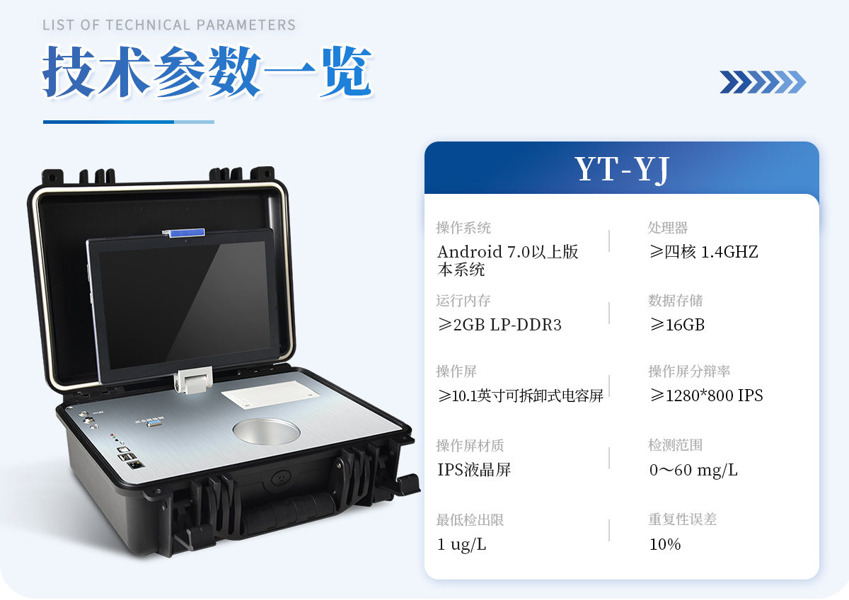 | 基本概述:便攜式箱體化一體機(jī),采用防水、抗壓、防撞擊、防腐蝕箱體設(shè)計(jì),滿(mǎn)足車(chē)載環(huán)境、無(wú)電源環(huán)境以及戶(hù)外檢測(cè)需求; | 主機(jī):具備檢測(cè)功能、輔助功能、管理系統(tǒng)軟件、信息化管理功能,信息化實(shí)現(xiàn)數(shù)據(jù)雙向傳輸,能直接接收管理中心下發(fā)任務(wù),并實(shí)時(shí)上報(bào)檢測(cè)結(jié)果至管理平臺(tái); | 檢測(cè)技術(shù):采用陽(yáng)極溶出伏安法檢測(cè)技術(shù); | 操作系統(tǒng):Android 7.0以上版本系統(tǒng); | 處理器:≥四核 1.4GHZ; | 運(yùn)行內(nèi)存:≥2GB LP-DDR3; | 數(shù)據(jù)存儲(chǔ):≥16GB; | 通訊接口:包含兩個(gè)USB接口、網(wǎng)線(xiàn)接口、WIFI、藍(lán)牙、4G模塊,內(nèi)置GPS接口,用于戶(hù)外或者其他移動(dòng)檢測(cè)定位; | 指示燈:具有熱敏打印機(jī)工作指示燈,用于提示打印機(jī)工作狀態(tài);具有電源充電指示燈,用于提示儀器充電狀態(tài);具有無(wú)線(xiàn)藍(lán)牙對(duì)接狀態(tài)提示燈,用于提示操作平臺(tái)與儀器主機(jī)連接狀態(tài);具有儀器工作狀態(tài)提示燈,用于提示儀器主機(jī)是否處于工作狀態(tài); | 操作屏:≥10.1英寸可拆卸式電容屏設(shè)計(jì),操作屏可以固定在儀器上,也可以取出單獨(dú)操作實(shí)現(xiàn)運(yùn)程控制; | 操作屏分辯率:≥1280*800 IPS; | 操作屏材質(zhì): IPS液晶屏; | 輸入方式: 電容屏、觸摸輸入、支持多點(diǎn)觸控; | 采用無(wú)汞電極,安全無(wú)毒; | 模塊自帶攪拌功能,啟動(dòng)后既可自動(dòng)攪拌溶液。 | 檢測(cè)范圍: 0~60 mg/L ,**檢出限:1 ug/L; | 重復(fù)性誤差: 10%; | 具有自動(dòng)尋峰功能,計(jì)算出樣品**數(shù)據(jù); | 內(nèi)置線(xiàn)性?huà)呙琛⒊R?guī)脈沖掃描、微分脈沖掃描; | 儀器現(xiàn)場(chǎng)取證功能: 儀器具有800萬(wàn)以上防抖、自動(dòng)對(duì)焦高清攝像頭,對(duì)檢測(cè)實(shí)樣進(jìn)行現(xiàn)場(chǎng)拍照取證; | 電源控制器: 雙電源控制器,節(jié)省電量; | 運(yùn)程控制:支持20米內(nèi)無(wú)線(xiàn)藍(lán)牙控制儀器檢測(cè),方便使用者沒(méi)在儀器身邊時(shí)也能完成項(xiàng)目檢測(cè); | 打印: 內(nèi)置微型熱敏打印機(jī),可隨時(shí)打印檢測(cè)結(jié)果; | 電池:內(nèi)置大容量可充電鋰電池,可連續(xù)工作5小時(shí)以上; | 箱體: 便攜一體化手提箱,箱體能防水,抗壓,整機(jī)重量小于5kg,攜帶方便; |