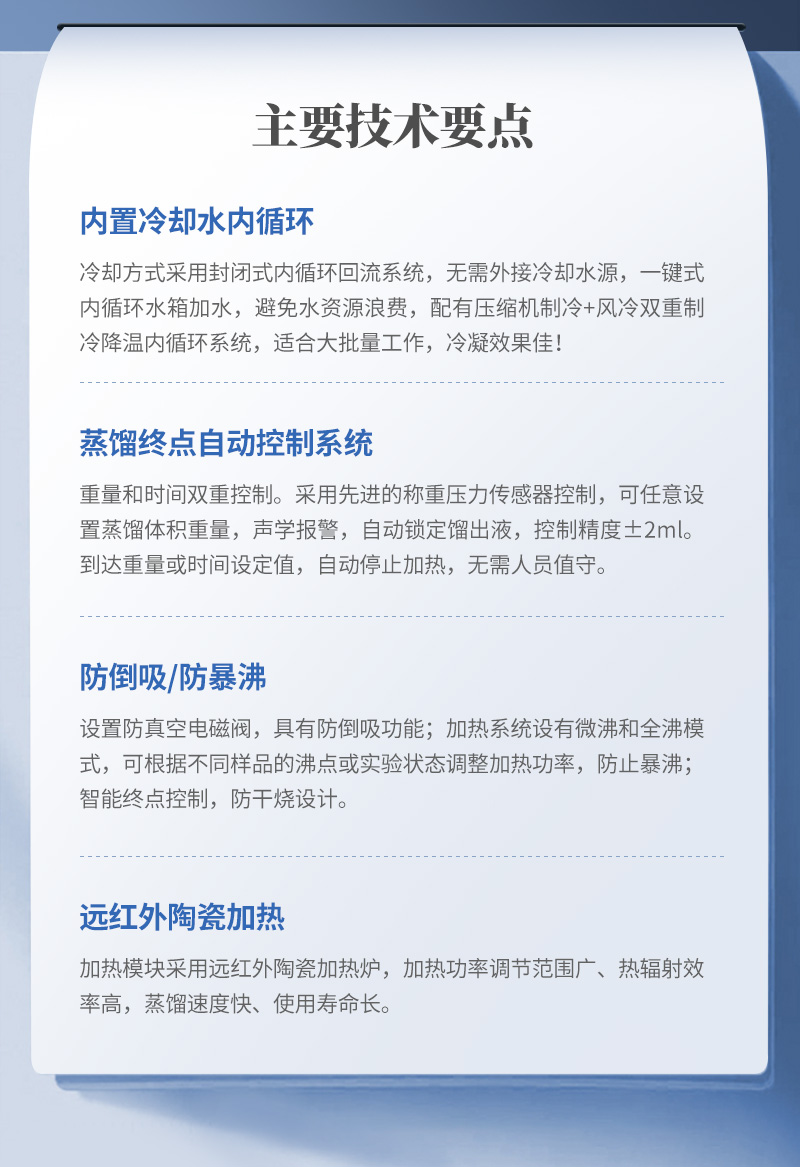 | 1、加熱方式:采用遠紅外陶瓷加熱爐,紅外線輻射加熱(無明火加熱、防水); | 2、加熱單元:6個,可單孔單控制; | 3、升溫時間:5-8min; | 4、蒸餾速度:2-12ml/min; | 5、蒸餾終點控制:自動偵測蒸餾終點功能,采用稱重和時間雙重控制,蒸餾體積控制在±2ml之內(nèi),自動化程度高; | 6、單爐加熱功率:0-450W(單孔可調(diào)); | 7、加熱功率:0-2700W(可調(diào)); | 8、冷卻方式:封閉式內(nèi)循環(huán)回流系統(tǒng),也可外接冷卻水源; | 9、防倒吸:設有防真空電磁閥,具有防倒吸功能; | 10、時間控制:0-200min可調(diào); | 11、蒸餾瓶規(guī)格:500mlX6,250 X6 更多規(guī)格可選; | 12、額定電壓/頻率:220V/50HZ; |